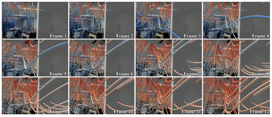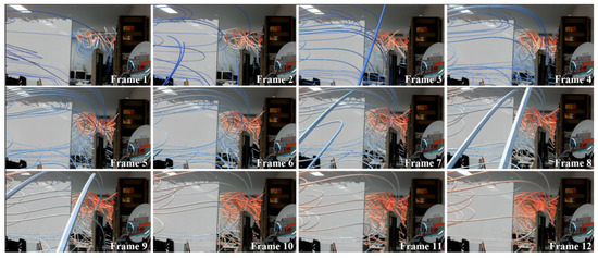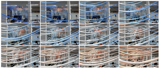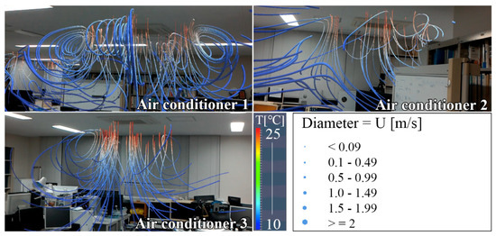 The CFD animation and MR system were operated on different hardware, personal computer (PC) and HMD. The HMD Toolkit is a plug-in used to adjust the MR system, pack the game engine contents onto the HMD, and integrate the animated CFD post-processing data with the MR system. To ensure the correct display position of the simulated airflow model, the coordinates of the virtual world and the real world must be unified. A cube, created to locate the CFD result and target room, was also set as the world anchor, termed the “anchor cube”, to be able to adjust and ensure a stable registration. It was bound to the SLAM-generated mesh to avoid manual re-registration every time the application started up. Figure 2 is screenshots of the MR visualization results from the HMD which shows the initial state of indoor thermal environment in areas around the three different air conditioners; the streamline color indicates the temperature gradient, and the streamline diameter indicates the airflow rate.