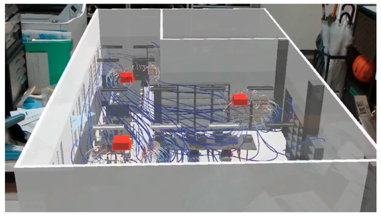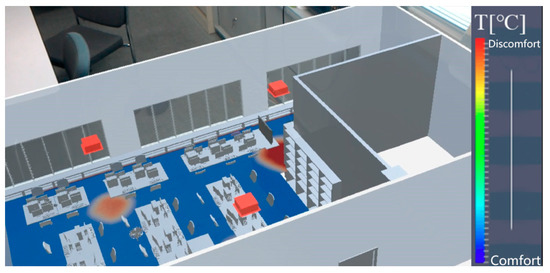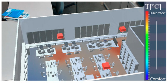 The heat map, calculated by CFD software, is registered in the real world by SLAM. The screenshots of the MR visualization result are shown in Figure 4. The three rectangular occlusions near the left ceiling light are the location of the air conditioner used in the calculation, and the occlusion around the bookcase and wall edges is generated in real time. Figure 5 shows the user’s visual experience of the heat map, combined with a small-scale model of room 411. Figure 6 shows the user’s visual experience of comfort map, where comfort zone shows blue color and discomfort zone shows red color. The comfort zone is where the indoor temperature is 27.2 °C in summer and 17 °C in winter, meanwhile, the upper and lower temperature difference is within 3 degrees [38,39]. Referring to Figure 5 and Figure 6, the user can easily know that the cause of the three circular red discomfort zones in Figure 6 is because the upper and lower temperature difference is too large under the air conditioners, and the corner red discomfort zone is formed because it is too far to transmit heat from the air conditioner in a short amount of time.