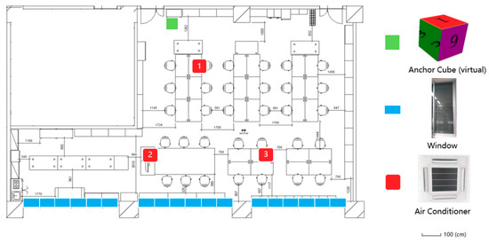To test the proposed MR system with animated CFD in chapter 3, we developed the prototype system. An evaluation test was carried out in room 411, building M3, Suita Campus, Osaka University (north latitude: 34.82°; east longitude: 135.521°). Building M3 was completed in January 2015 and serves as a research building for the Graduate School of Engineering. The research office, lecture room, and laboratory were mixed, and room 411 is a student office. The total area of room 411 is 150 m2. There were three operating air conditioners and 18 windows without curtains; the anchor cube was set next to the front door (the same position in both the real and digital world), where registration was provided (Figure 7). The start date and time of analysis were set at 9:15 of 17 and 18 December, in winter (GMT + 9). The solar altitude was 20.65°, and the solar azimuth angle was 141.08° (due north, east, south, and west; azimuth is 0°, 90°, 180°, and 270°, respectively). As a control group, the shading plates were used on December 17 to cut off daylight. In the CFD analysis, the sun’s position was determined by using the above information. Solar radiation was 90.28 W/m2 in reference to the Japan Meteorological Agency database.