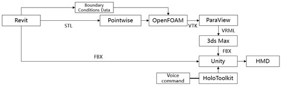 As one of the main objectives for the stock renovation, the buildings should be designed to save energy, be environmentally friendly, and create a comfortable living space [2]. Bad indoor thermal experience accounts for a large proportion of householders’ complaints [3]. Consequently, home renovation has become a common choice for improving their indoor thermal environment, which typically includes window replacement, better insulation, installation of a more efficient heating system, and improvements in house airtightness and natural ventilation, using mechanical ventilation systems [4]. However, improvements in thermal indoor environments are hampered by an outmoded renovation design process that fails to efficiently coordinate design aspects (architectural, facilities, structural, and environmental) while problem-solving issues and handling the feedback loop in a timely manner. Therefore, the integration of building performance feedback in the design process is increasingly being considered as a core element of the decision support framework that currently drives sustainable building, from early conception to fabrication [5]. During the renovation process, it is necessary to achieve simultaneous architectural, systematic, structural, and environmental design to accomplish a healthy, comfortable, and energy-saving indoor environment, prevent delays in problem-solving, and achieve a timely feedback process. The renovation design process typically follows a waterfall model, which is sequential and noniterative. Because all the design steps are not synchronized and thermal design is a later consideration in the waterfall approach, feedback from customers comes too late [6]. If any design steps conducted at the latter process finds some problems, there is no scope to feedback the design of the former process. This problem has resulted in occupants facing uncomfortable experiences. In recent years, several new methods for a more efficient building-design process have been proposed which encourage stakeholders to collaborate in a synchronized manner [7]. Building information modeling (BIM), which contains up-to-date geometry information and building properties, is an emerging method for managing building lifecycles [8], and it has been proposed for realizing simultaneous building design with consideration to the lifecycle data of the entire structure [9]. Additionally, computational fluid dynamics (CFD), which uses numerical methods to solve fluid mechanics problems, can be used to analyze fluid flows in the design of thermal environments. Building designs using CFD and BIM can streamline the design cycle and enhance the coordination of all building-design departments. However, simply input CFD information to the BIM model does not allow all stakeholders to participate in environmental design. For the stakeholders, one of the challenges lies in how to integrate BIM intuitively with CFD software. In fact, methods of integrating BIM and CFD, such as Autodesk CFD and DesignBuilder, have been proposed [10,11]. CFD analysis produces a large amount of numerical data that can be used in three-dimensional (3D) modeling by using the proposed post-processing software. However, such software is not open source and cannot export the arrows and color map information of simulation results as vector data [12]. Integrating CFD results with other systems has many limitations. Additionally, there is difficulty in building a relationship between the CFD model and the BIM model in the 2D display. If the indoor environment can be displayed immersive to provide a more intuitive experience, the communication between designers from the different departments will lead to more accurate and faster implementation of a design so as to increase satisfaction among customers. Mixed reality (MR) is a technology that blends digital content with real-world content, enabling users to experience the interaction between the real world and the digital one in real time [13]. Therefore, the method of integrating CFD and MR to combine CFD results and the real-world is proposed in this research.