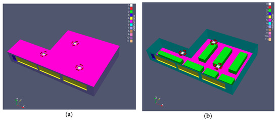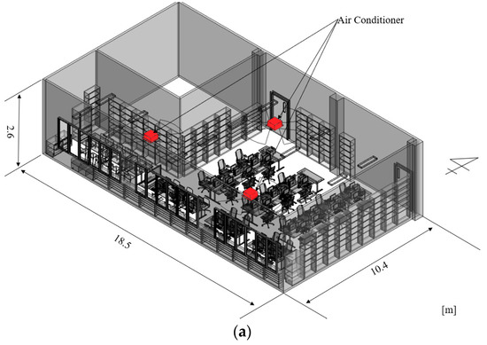 Building the BIM model, as shown in Figure 9, to generate mesh or CFD analysis was created by Revit. The mesh and boundary setting were set based on the BIM model, as shown in Figure 10a. In order to improve simulation accuracy, simplified tables were added into the mesh, as shown in Figure 10b.