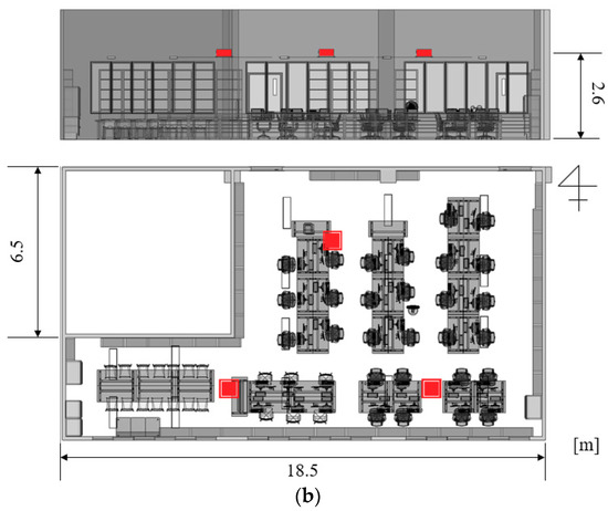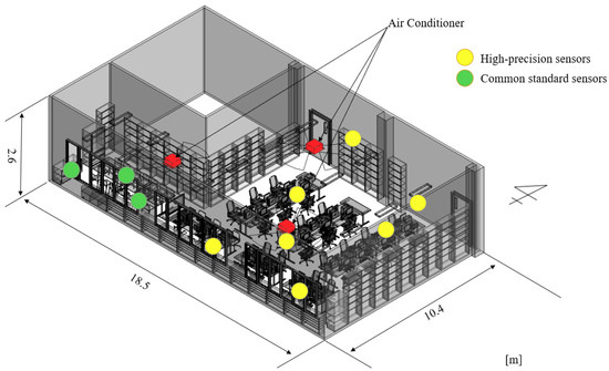 (1) Sensor installation: Ten sensors (Thermoclone G type, KN Laboratories) [45], as shown in Figure 11 and Table 5, were evenly distributed throughout the room.