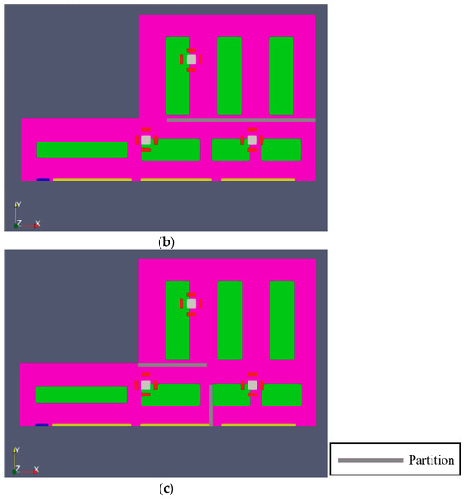Three new building meshes were generated, as shown in Figure 12. The same boundary conditions as in Table 1 and Table 2 were applied, and the air conditioner ran for 2 min, same as the validation. Each case was divided into three solutions: the original single-glazing window design and the new proposal, double-glazing window design, combined with the original metal sash material and the resin sash material. The window thermal transmittance properties were calculated according to the method of Hosokawa et al. [19]. The values are shown in Table 8. Daylight affects the temperature of the indoor room, while the sash of different materials and the window of different structures would affect its result. Therefore, an experimental group without daylight is necessary.
