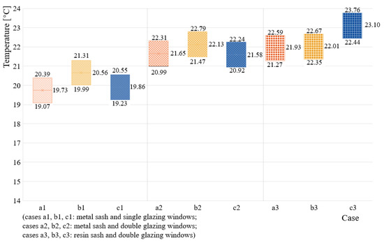 After combining three kinds of partition settings and three kinds of window designs, we simulated nine situations in OpenFOAM. The average temperature distribution of the CFD simulation results is shown in Figure 13. The results show that cases a3, b3, and c3 are the fastest warming proposals than the other cases, indicating that the resin sash and double glazing did help to improve the indoor thermal insulation effect. The highest average temperature was for case c3, which was 3.37 °C higher than that for case a1, which had the lowest average temperature. The temperature increased by 17.08% compared with the original data. In addition, adding the partition slightly improved the room temperature by improving the indoor airflow. The box diagram of the average temperature results (plus positive and negative error values: 0.66) shows in Figure 13 that, as the windows increase from single glazing to double glazing, the sash changes from metal to sash, the average temperature gradually rises. Some data from the proposed improvement methods reported lower temperatures. Therefore, an experimental group without daylight was conducted. The results in Table 9 show that, with the improvement of sash and window, the indoor average temperature has increased in accordance with the expected step. The reason for these results was that the metal sash can absorb the heat of daylight faster than resin sash, and it will cause the illusion that the indoor average temperature rises rapidly in the short time of the experiment. Therefore, the results were acceptable overall.