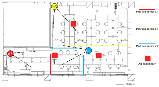- Case b: Divide the room into two parts: one provided with natural light and ventilation and the other enclosed in an air-conditioned environment, in order to meet the different needs of students.
