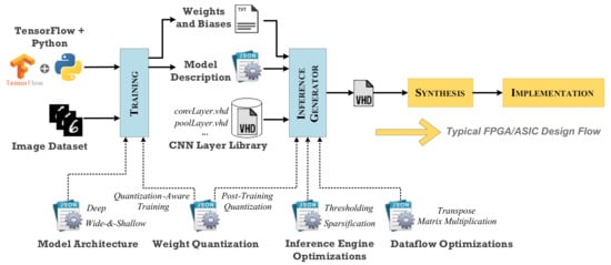 The proposed framework allows software developers to reap the benefits of FPGA/ASIC acceleration for their complex CNN models, while avoiding the learning curve of FPGA/ASIC design and the time overhead of HDL development. Hardware and architectural optimizations as well as available optimization techniques of HLS tools, are exposed to the software developer as tuning knobs inside a pool of optimization capabilities. The software programmer has the option to enable or disable the proposed optimizations depending on the requirements of the respective system and the use case. The proposed framework enables automatic and transparent generation of high-throughput FPGA- and ASIC-based CNN accelerators, by extending the well known TensorFlow [,] system with automatic acceleration capabilities. It uses a Python inference engine generator that accepts as input the CNN model description and its parameters, i.e., image size, kernel filter window size, number of input and output feature maps etc., declared in a JSON file. The software developer can choose out of a variety of optimization techniques including model architecture optimizations, weight quantization techniques, inference engine optimizations, and dataflow optimizations that apply to the generic CNN architecture. These optimizations can be applied incrementally and deliver a final accelerator that fits the requirements w.r.t. the desired accuracy and performance trade-offs. We note that the generated inference engine is a synthesizable VHDL code, ready to be deployed on an FPGA device or synthesized with a standard cell library targeting a semi-custom ASIC.