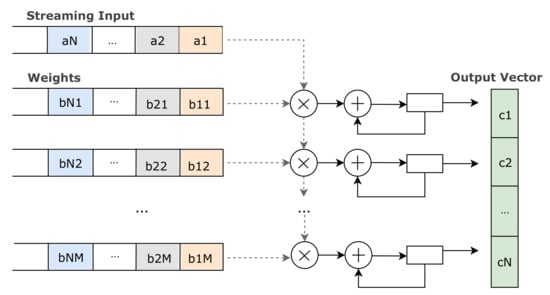 The typical implementation of the matrix multiplication requires input data buffers, first to be filled, and then execute the multiplication. This data buffering imposes inefficient resource utilization regarding the hardwired multipliers, interrupting the continuous operation of a pipelined design. In order to tackle the aforementioned bottleneck, we perform the matrix multiplication by transposing the weight matrix and implementing M parallel FIR filters (MACs), as illustrated in Figure 2. All the FIR filters take as input the same streamed data (). The j-th FIR filter uses the j-th column of the weight matrix and produces . The output vector is partially created, and when the last data () is served, it is forwarded to the next layer, and thus, the processing of the next batch can start with no delay.