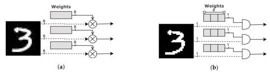Multiplication in the convolutional layer: (a) 8-bit input images require the use of conventional multipliers. (b) Input thresholding creates binary images [], enabling the employment of AND gates rather than multipliers.