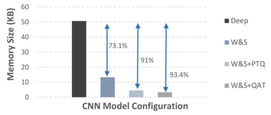 Figure 4 presents the memory footprint gains in comparison with the initial deep model. The derived results show that the conversion of the deep model to a wide-and-shallow one results to a 73.1% reduction in the on-board required memory. By further applying the post-training quantization, we achieve a total memory saving of 91%. When selecting quantization-aware training rather than the post-training quantization method, we achieve a total memory saving of 93.4% in comparison with the original model. Considering that quantization-aware training exhibits smaller accuracy loss (see Table 1) as well as slightly larger memory gains (see Figure 4) versus the post-training quantization, we choose to employ it in our final inference engine accelerator.