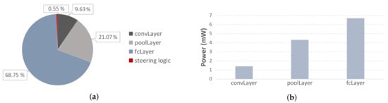 Standard-cell-based ASIC accelerator of the LeNet inference engine, synthesized at the critical path delay (1.93 ns): area percentage and power consumption per layer. (a) Area percentage per layer. (b) Mean power per layer.