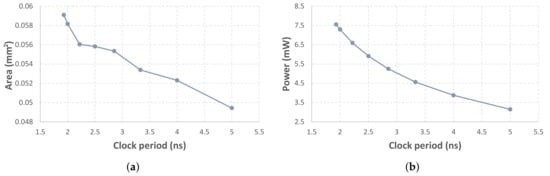 In Figure 7, we present the variation of area and power w.r.t. the synthesis clock. Starting with a clock of 520 MHz, i.e., the clock that respects the critical path delay, we decrease the frequency to 500 MHz, and then we adopt a constant decrease with a step of 50 MHz. The derived results show that area is decreased almost in a linear fashion, while power decreases exponentially. The area-delay-product (ADP) ranges from 0.11 ns ×mm to 0.25 ns × mm, with the high-performance configuration at 1.93 ns providing the best value. On the other hand, the power-delay-product (PDP) remains in the interval 14.6–15.7 ns × mW. As for ADP, the best PDP is achieved when the inference engine is synthesized at its critical path delay.