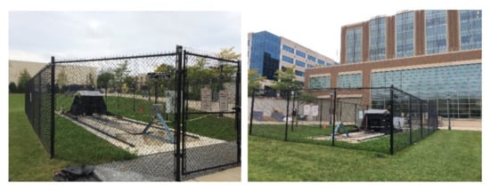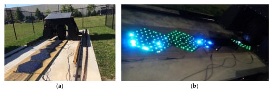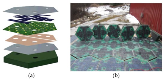 The first implementation of PV cells in pavements (i.e., SR1) in the U.S was done by Solar Roadways®, Incorporated (SRI) []. In 2012 SRI improved the design and replaced the upper layer of the road pavement (i.e., SR2) []. SRI used engineered solar panels that can support traffic loads and produce electrical energy. Each panel has area 0.37 m2 and can produce 36 W. SRI then added LEDs to the prototype for illuminating road edge striping for improved safety while driving at night. To prevent ice/snow accumulation in winter/cold climates, SRI added a heating element (like the defrosting wire in the rear window of cars) on the surface of the module. Solar roadway “SR” can be thought of as an intelligent highway system that is equipped with microprocessor-based controller unit that can activate the LED lights and facilitate wireless communications. The upper layer of the prototype was patented in 2014 []. Brusaw stated that the conversion efficiency of the overall system was 11.2% [].