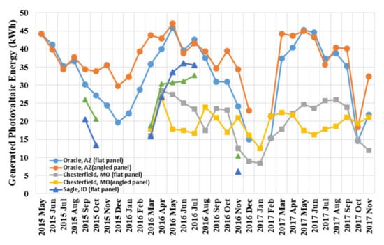 The main purpose of the SRPs is electricity generation. Solar Roadway Inc. collected some energy harvesting data for solar panel at three different latitudes in USA, (i.e., Oracle, AZ (Latitude 32°34′47.38" N); Chesterfield, MO (38°38′27.81" N); Sagle, ID (48°13′49.38" N). SRI used commercially available solar panels. Since the pavement panel will be flat unlike roof top panels, SRI collected two types of data: one keeping the panels flat, the other with the panel placed at optimal angle. 250 W solar panels were used in the Oracle, AZ and Chesterfield, MO sites, whereas in Sagle, ID site 220 W panels were used. Figure 4 shows all harvesting data from May 2015 to November 2017. Earlier Solar Roadways have conducted power generation capabilities of their “SR2” solar road panel prototypes. Four of these hexagonal panels can produce 52.397 KWh energy over six-month periods as recorded in micro-inverter. A 12 feet wide lane can accommodate 15,840 panels per lane mile. Therefore, the estimated energy production is 414.984 MWh per year per lane mile. This is estimated for a 69% coverage area. However, for “SR3” prototype cell coverage is near 100%. In that case the energy output will be 601.426 MWh per year per lane mile. Estimated energy consumption for LEDs is 601.426 MWh per year per lane mile, if they are on 100% of the time (which is very unlikely). Similarly, the microprocessor section will consume 106.311 MWh per year per lane mile assuming they are active 100% of the time. Subtracting these consumptions net energy production is 302.51 MWh per year per lane mile, which can serve the electricity need of 30 residential utility customers per lane mile. For 100% (as in the case of SR3 prototype) coverage, this number will increase to 43 customers. Therefore, a two-lane road in a rural area can provides off grid electricity for 86 homes along the Canadian border. Moving to the southern part of the country this number increases.