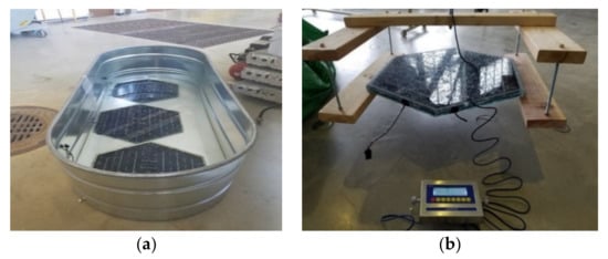 Moisture conditioning duration testing: (a) single 1135.62 litter aluminum container used during the SRP moisture conditioning duration testing. The paver electrical connectors were fixed above the waterline during testing; (b) test apparatus for weighing the solar road panels (SRPs) before and after each moisture conditioning test.
