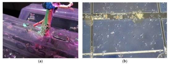 The degradation of the LED performance is not due to repeated loading. It was attributed to the process uncertainty during SRP manufacturing as shown in Figure 8a, for example (i.e., cracked internal PV cells, internal in-polymer “bubble” formations, variances in the external “etched” surface grip/traction features, etc.). In addition, the continuous outdoor operation may have allowed moisture ingress from cracked wire shields as also observed in moisture test, as shown in Figure 8b.