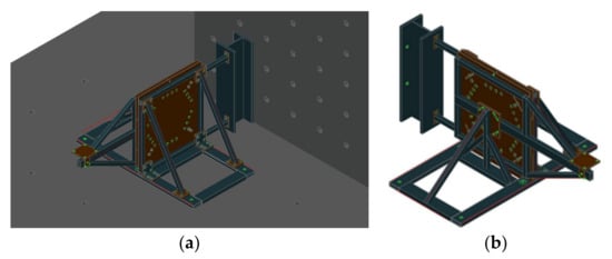 The test fixture is shown in Figure 11. The fixture consists of a fixed back plate constructed of 1.27 cm steel plate reinforced by 5.08 cm x 5.08 cm steel tube welded to the perimeter connected to both the laboratory’s strong floor and strong wall (Figure 11a), and a front plate that is free to rotate (Figure 11b).