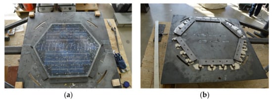 (a) Front of test fixture with original steel grips and a paver installed; (b) front of test fixture with reinforced grips.