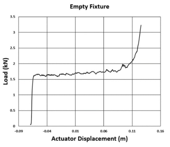 The test fixture was run through over 17.78 cm of actuator displacement without a paver in place several times to establish the frictional resistance of the system and to ensure there was no off-axis binding occurring over the entire planned test deflection. As the plot in Figure 14 shows, the weight of the fixture and the frictional component is relatively constant up to a fixture deflection of approximately +10.16 cm (absolute value) at which point a significant increase in load develops indicating the actuator was no longer moving orthogonally with respect to the fixture arm and binding occurred. This data set shows the maximum test span available to be 17.78 cm or 0.13 radians opposed to the design maximum of 0.148 radians.