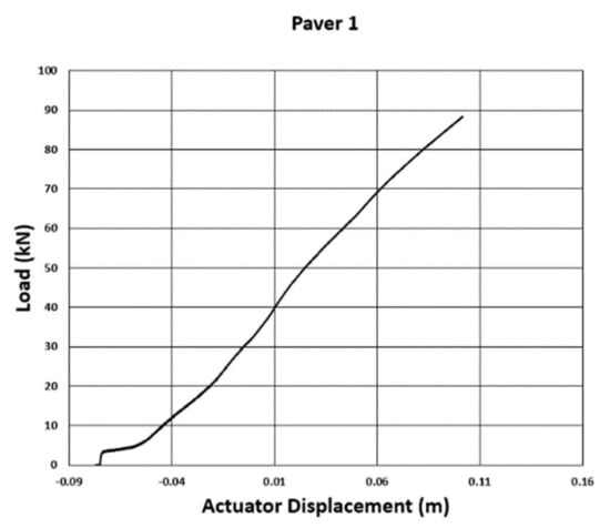 Paver 1 was the first specimen tested. The load vs. actuator deflection for Paver 1 is shown in Figure 15. The applied load was significantly greater than anticipated and as a result, the fixture grips (1.27 cm A36 steel) deformed. This deformation allowed the panel to experience a decreased load compared to what the panel would have experienced had the grips stayed rigid and not deformed during the test. The test was stopped at an actuator deflection of +10.16 cm, our previously determined maximum testing deflection of the fixture. After the Paver 1 test, the fixture was disassembled, and the steel grips were re-designed and manufactured as previously discussed in test methodology.