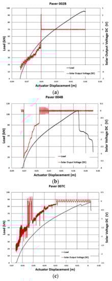 Load vs. actuator deflection with voltage output for (a) Paver 002B; (b) Paver 004B; and (c) Paver 007C (our material testing system (MTS) actuators are calibrated to within ±1.0% over the full range of both load and displacement.