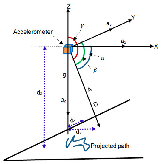 During quiet standing, human sway can be modelled using the principle of an inverted pendulum. A method for the evaluation of standstill balance is shown in Figure 1 and described using Equations (1)–(3) [25], where A is the resultant acceleration. The directional cosines of the three perpendicular acceleration vectors, ax, ay and az, are given by cos(α), cos(β) and cos(γ), respectively. The projected distance is D, and the position of the COM from the ground surface is dz.
