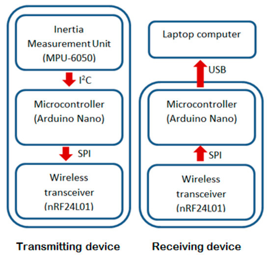 The overall system consisted of a transmitting device and a receiving device. The transmitting device measured the movements using an inertia measurement unit (accelerometer and gyroscope, type: MPU-6050). The measurements related to the three perpendicular axes (X, Y and Z) for movements. The data were sent wirelessly (by a wireless transceiver, type: nRF24L01) via a microcontroller board (type: Arduino) to the receiving device. On the receiving side, another transceiver (type: nRF24L01) received the accelerometry data and forwarded them to a laptop computer via a microcontroller board (type: Arduino). The computer then displayed the data and stored them for processing and analysis.