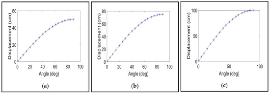 For the manual measurements, the means (M) and standard deviations (SD) for the positions were, position 1: M = 31.5 cm, SD = 16.6 cm, position 2, M = 46.9 cm, SD = 24.8 cm, position 3: M = 62.8 cm, SD = 33.3 cm. For the accelerometry-based measurements, the means and standard deviations were, position 1: M = 31.5 cm, SD = 16.7 cm, position 2: M = 47.2 cm, SD = 25.0 cm and position 3: M = 62.9 cm, SD = 33.3 cm. The accelerometry-based and manual measurements gave close readings for the three positions. The plots of the displacements against the angles for the accelerometry-based measurement of Table 2 are shown in Figure 6.