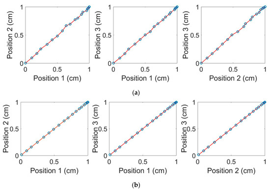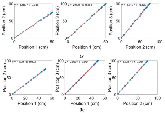 To test the relationship between the three positions for the manual and accelerometry measurements, Pearson's correlation with confidence interval 95% (α = 0.05) and linear regression were performed. For the manual measurements, there was a strong positive correlation between positions 1 and 2, r = 0.999; positions 1 and 3, r = 1.000; and positions 2 and 3, r = 1.000 (p ≤ 0.001). The relationships between the positions 1 and 2, 1 and 3 and 2 and 3 are shown in Figure 7. Similarly, for accelerometry measurement there was a strong positive correlation between positions 1 and 2, r = 1.000, positions 1 and 3, r = 1.000; and positions 2 and 3, r = 1.000 (p ≤ 0.001).