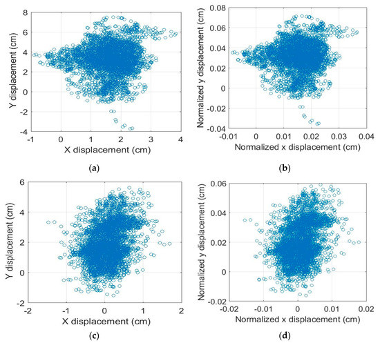 Figure 10 shows accelerometry-based sway plots from two healthy adult subjects in a standing still test on a foam surface with eyes closed (this is one of the tests associated with the Modified Clinical Test for Sensory Interaction of Balance [16]). The device containing the accelerometer was worn at lower back region at the level of the iliac crest. The plots show the ground projected displacements in the X and Y directions. For the plots in Figure 10a,b, the COM height of the subject was 105 cm and for the plots in Figure 10c,d, the COM height was 95 cm. Figure 10a,c was obtained from when the actual COM heights (L) were used in the formulae described in Section 3 and for the plots in Figure 10b,d, L was set to 1. The magnitudes of displacements shown in normalized plots of Figure 10b,d were comparable, while for those in Figure 10a,c, their relative displacements may not be comparable owing to the bias introduced by their respective COM positions.