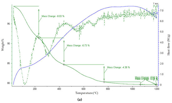 The sample’s thermal stability was studied by the thermogravimetric analysis (TGA) by the TGA instrument (Netzsch, STA 449C Jupiter, and TA Instruments SDT Q-600, Erich NETZSCH GmbH & Co. Holding KG, Selb, Germany). All the samples were heated from 25 to 1200 °C, and an airflow rate of 60 mL min−1 was maintained. The heating rate was 20 °C min−1. Differential scanning calorimetry (DSC) (Netzsch, STA 449C, and TA Instruments SDT Q-600, Erich NETZSCH GmbH & Co. Holding KG, Selb, Germany) measurements were carried out by maintaining the nitrogen flow rate of about 60 mL min−1.