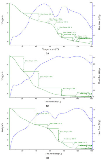 At the Zr adsorbent (Figure 5d) the next decomposition step takes place at 600 °C. The first of these is the loss of the last interlayer water through the relocation of the brucite-like layer. This is followed by the change in the structure of the material by the partial dehydroxylation of the brucite layer and the partial merging of the carbonate group into the structure. The third decomposition step occurs around 600 °C, which is the end of the dehydroxylation followed by the finishing point of decarbonization, which finishes around 700 °C [20]. The final dehydroxylation of the products to form a mixed metal solid solution occurs at almost 900 °C.