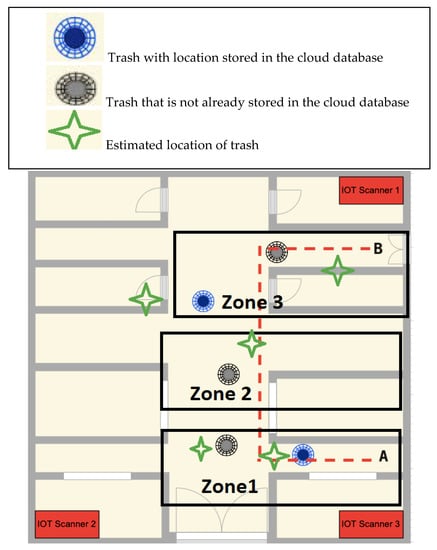 As shown in the figure, we want to from point A to point B move using the Smart Cane. We put office trashes as obstacles to test the object detection of the system. In this scenario the positions of the blue trash are already stored in the cloud database as obstacles. Whereas, the other trashes are not already stored in the database. We installed three IoT scanners in three corners of the building for location accuracy. Precision of the localization of the Smart Cane was expected to be between 50 cm and 100 cm in an area of 70 m × 50 m. During each experiment, the system includes the detected obstacles in the database and thus can help in the navigation for the user for the next experiments by taking less time for navigation, as shown in Table 1.