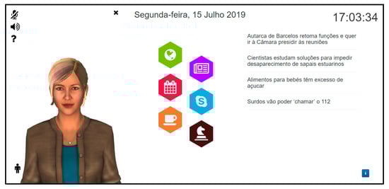 Figure 1 presents the dashboard of CaMeLi. The embodied conversational agent is presented in the lower left corner, in the middle of the screen the main menus are displayed (i.e., web, calendar, menu, news, Skype, and games), and at the right side of the screen the weather forecast and a summary of the latest news are presented. On the top of the screen, information to orient the users is presented, namely date and hour. In addition, in the upper left corner of the screen are displayed the microphone button, mute button, and the help button (with instructions about voice commands and information about the project). It is also possible to alter the gender of the embodied conversational agent by changing to the male version (in the lower left corner of the screen).