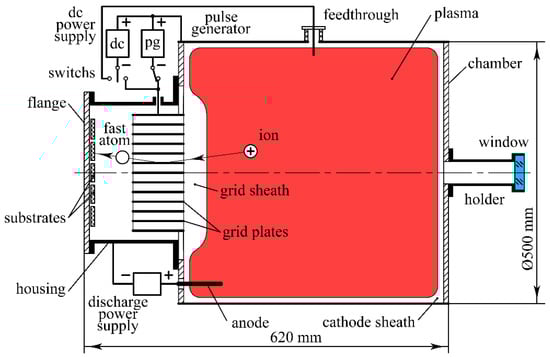 The implantation is carried out in vacuum with ion beam energies of ~100 keV and ion current densities typically between a few microamps to one milliamp per square centimeter. To generate the ion beams, accelerators of charged particles have been developed. They are characterized by a comparatively high cost and long processing time [12,13,14]. Moreover, the beam cross-section of those implanters is limited. To process large substrates or three-dimensional products, it is necessary to move and rotate them in a vacuum.