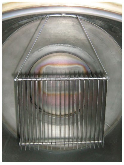 Figure 1 presents an experimental setup with a 50-cm-long and 50-cm-diameter process chamber with two doors. On the chamber top, there was feedthrough. It allowed the connection of any product placed inside the chamber to power supplies. On the left door of the chamber an 18 × 16 × 12 cm rectangular housing was mounted with a removable flange cooled with water. It allowed fastening on its inner surface substrates to be processed. Inside the housing, a grid was fixed on ceramic insulators (not shown in Figure 1). It was composed of 21 titanium 140 × 50-mm plates 0.5-mm-thick and 7.5 mm apart.