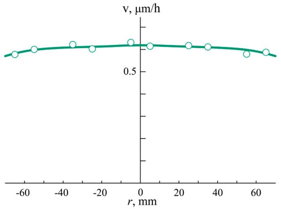 Due to homogeneity of the discharge plasma near the grid, the width of the space charge sheath between the grid and the plasma was distributed quite uniformly. For this reason, the beam of fast argon atoms bombarding the substrates was well collimated. This was confirmed by an abrupt transition between the substrate surfaces in Figure 3 covered with the mask (on the left) and open (on the right), as well as a homogeneous distribution of the substrate etching rate (Figure 4).