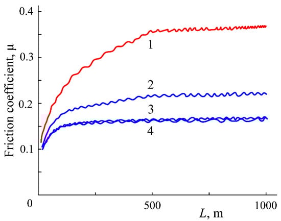 Dependence of the friction coefficient µ on the sliding distance L for an untreated substrate (curve 1) and substrates irradiated with 30-keV argon atoms for 30 (curve 2), 60 (curve 3) and 90 s (curve 4).