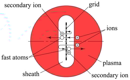 For bombardment by high-energy particles of dielectric products, it was proposed to use a high-transparency grid immersed in plasma (Figure 7). When a negative high voltage is applied to the grid, it is surrounded by a space–charge sheath. Accelerated from the plasma ions pass through the grid holes, are decelerated on the other side of the grid and change direction of their movement.