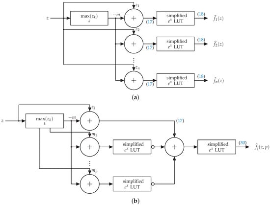 Subsequently, is subtracted from all the component values as dictated by (17). The subtraction is performed through adders, denoted as in Figure 2, using two’s complement representation for the input negative values . The obtained differences, also represented in two’s complement, are used as inputs to a LUT, which performs the proposed simplified operation of (18), to compute the final vector as shown in Figure 2a. Additional terms are added and subsequently each output through (30) generates the final value for the softmax-like layer output as shown in Figure 2b. For the hardware implementation of the function, an LUT is adopted the input of which is . The LUT size increases on the larger range of . Our proposed hardware implementation is simpler than other exponential implementations which propose CORDIC transformations [32], use floating-point representation [33], or LUTs [34]. In (33), the values are restricted to the range and the derived LUT size significantly diminishes and leads to simplified hardware implementation. Furthermore, no conversion from the logarithmic to the linear domain is required, since represents the final classification layer.