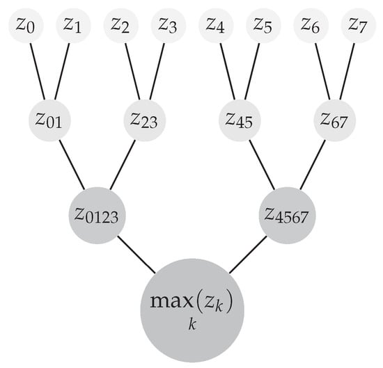 Figure 2 depicts the various building blocks of the proposed architecture. More specifically, the proposed architecture is comprised of the block which computes the maximum , i.e., . The particular computation is performed by a tree which generates the maximum by comparing the elements by two, as shown in Figure 3. The depicted tree structure generates , . Notation denotes the maximum of and , while denotes the maximum of and . The same architecture is used to compute the top maximum values of s. For example, , , and are the top four maximum values and is the maximum.