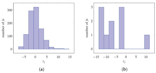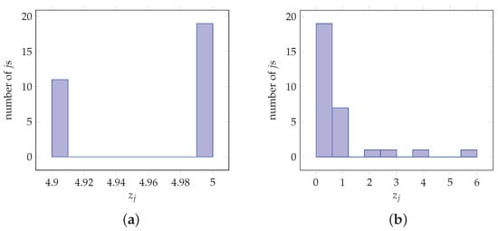 the histogram of which is shown in Figure 4b. In this case, the statistical structure of the vector demonstrates and . The feature of vector in Example 2 is that it contains three large different component values close to each other, namely and all other components are smaller than 1. The softmax output in (1) for the values in the particular are