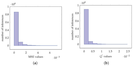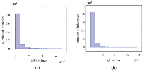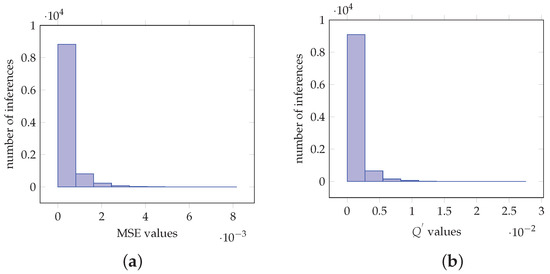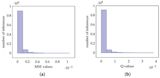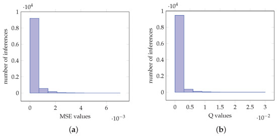Similar analysis can be performed for the case of VGG-19. In particular, Figure 9a demonstrates that MSE is of magnitude and 8351 of which are in the interval . In Figure 9b 8380 values are in the interval . For the case of InceptionV3, histograms in Figure 10a,b demonstrate MSE and values the 9194 and 9463 of which are in the intervals and , respectively. For the MobileNetV2 network, Figure 11a,b demonstrate MSE and values the 8990 and 9103 of which are in the intervals and , respectively. Furthermore, Table 1c–e derive similar conclusions as in the case of VGG-16.