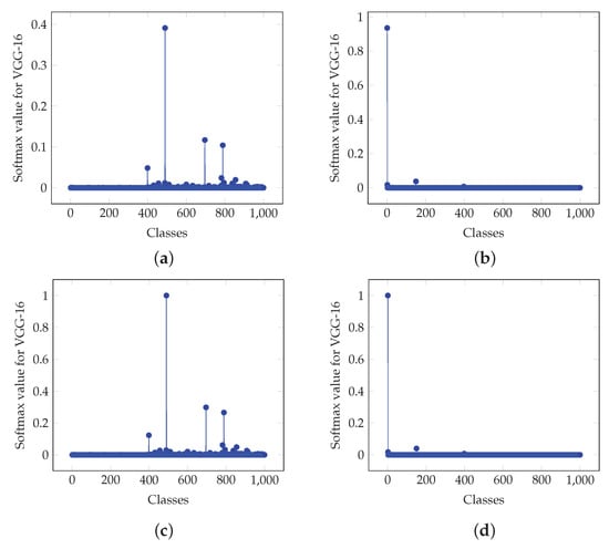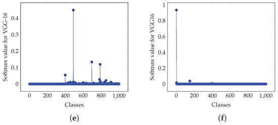 Moreover, Figure 8a,b depict graphically the values for the actual softmax and the proposed softmax-like output for inferences A and B, respectively, for the case of the VGG-16 CNN for the output classification. Furthermore, Figure 8c–f depict values for the architectures in Figure 2a,b, respectively. It is shown that in the case of Figure 2a, the values demonstrate a similar structure. In case of Figure 2b, values are similar to the actual softmax outputs.