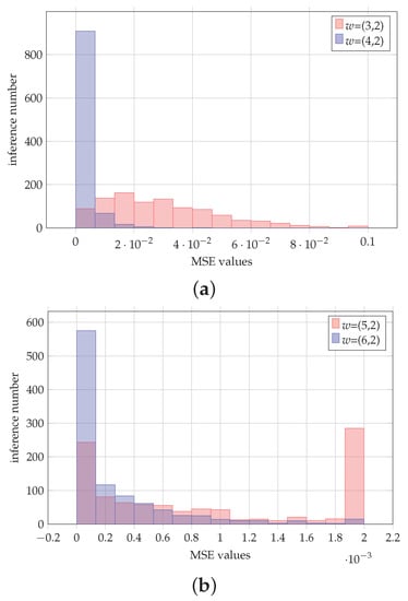 Considering the impact of the data wordlegth representation, let denote the fixed-point representation of a number with integral and fractional bits. Figure 12a,b depict histograms for the MSE values obtained for the case of 1000 inferences by the VGG-16 CNN. It is shown that the case demonstrates the smaller MSE values. The reason for this is that the maximum value of the inputs in the softmax layer is 56 for all the 1000 inferences, and hence the value of 6 for the integral part is sufficient.