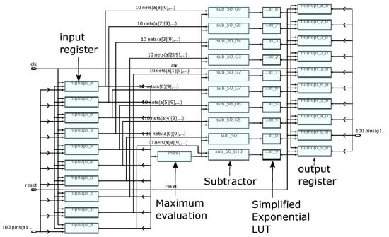 - Li, Z.; Li, H.; Jiang, X.; Chen, B.; Zhang, Y.; Du, G. Efficient FPGA Implementation of Softmax Function for DNN Applications. In Proceedings of the 2018 12th IEEE International Conference on Anti-counterfeiting, Security, and Identification (ASID), Xiamen, China, 9–11 November 2018; pp. 212–216. [Google Scholar]