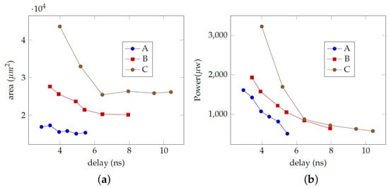 Figure 13 depicts the architecture obtained from synthesis where the various building blocks, namely maximum evaluation, subtractor and the simplified exponential LUTs that perform in parallel, are shown. Furthermore registers have been added at the circuits inputs and outputs for applying the delay constraints. Detailed results are depicted in Table 2a–c for the proposed softmax-like of Figure 2a, the [22] and the proposed softmax-like of Figure 2b layer with size 10, respectively. Furthermore, results are plotted graphically in Figure 14a,b where area vs. delay and power vs. delay are depicted, respectively. Results demonstrate that substantially area savings are achieved with no delay penalty. More specifically, for a 4 ns delay constraint the area complexity is 25,597 m and 43,576 m in case of architectures in Figure 2b and [22], respectively. For the case where the pdf output is not significant, the area complexity reduction can be 17,293 m for the architecture on Figure 2a. Summarizing, depending on the application and the design constraints there is a trade-off between the additional terms used for the evaluation of the softmax output. As we increase the value of the parameter , then the actual softmax value is better approximated while hardware complexity increases. When , then the hardware complexity is minimized while softmax output approximation diverges.