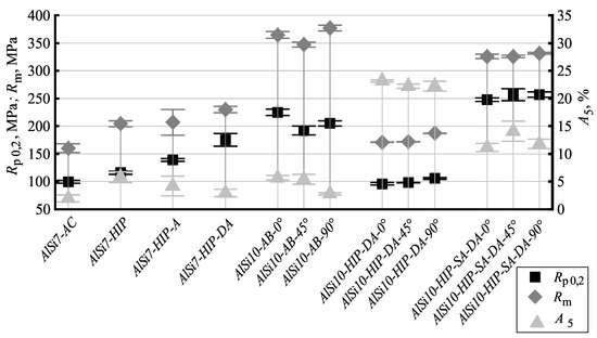 Tensile test samples of the alloy AlSi10Mg0.3 were built in 0, 45 and 90 inclination to the substrate plate. Series Aluminum–Silicon AlSi10-HIP-DA was hot isostatically pressed, the same as sample series Aluminum–Silicon AlSi7-HIP-DA. Series Aluminum–Silicon AlSi10-HIP-SA-DA was additionally heat treated by solution annealing followed by water quenching and immediate artificial aging at 165 C for 150 min.
