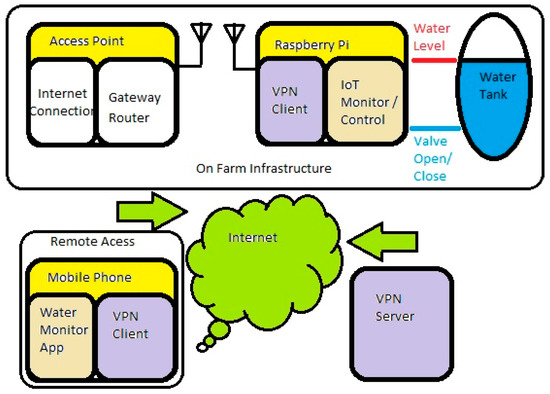 In this research, we visualize our proposed a scalable IoT security model deployable on-farm infrastructure for a water tank monitoring system, as shown in Figure 1. The on-farm IoT Raspberry Pi device manages both the environment (the water tank) and creates the VPN tunnel to the VPN server with the integrated VPN client. The Raspberry Pi also has a Wi-Fi link that connects directly to the Access Point (AP). The AP then connects to the internet. The VPN tunnel created by the Raspberry Pi, bypasses the AP through port 500 (always open) and connects directly to the VPN server, which exists in a remote location.