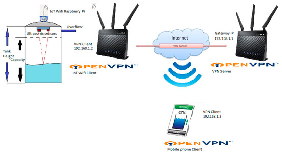 We developed a prototype water tank with a water level monitoring device using a simple conduction sensor, as shown in Figure 2. We applied our proposed IoT security model to the case scenario to implement smart water monitoring and management with end-to-end security. For our proof-of-concept pilot implementation, two tanks were monitored, a household greywater system (2000 L), and an on-farm tank in another location (45,000 L). These were fitted with ultrasonic sensors, valve solenoids, and pressurizing pumps. Figure 3 shows an illustration of the deployment of our end-to-end security model using OpenVPN with one of the water tanks. The levels of the individual tanks can then be checked remotely, and refilling can be automated based on parameters, such as time of day, low-level minimum values, or by remote manual intervention. An ultrasonic tank level sensor with a Sentryrobotic Wi-Fi transmitter is adopted for this case scenario based on the SMART water tank monitor system [87] and the pi-tank-watcher [88].