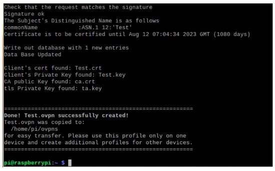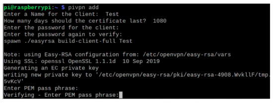 Our proposed IoT security model ensures that the security measures are first enforced with OpenVPN optimization, and tuning before deploying the IoT enabled devices for the smart water monitoring system. We provide details on how the OpenVPN connecting the IoT enabled nodes establishing the end-to-end security protocols are implemented. Figure 4 demonstrates the authenticated OpenVPN connection established using a simple user-interface. The Open VPN server creates the OVPN script, a script file with extension .ovpn, which is shared securely with the OpenVPN clients. This is used by the clients to establish a secure connection to the server. Figure 5 provides an illustration of running the OVPN script for generating Rivest–Shamir–Adleman (RSA) keys, and Figure 6 shows the creation of a VPN certificate using SSL security protocol successfully. Once a secure connection is established, the server issues a Dynamic IP address using Network Address Translation (NAT) protocols. Once a NAT address has been issued to the client, the client is free to communicate with all other clients in the VPN network. Currently, there are two types of clients in the VPN network. One has the IoT devices associated with it in an integrated Raspberry Pi acting as a discrete element. The other device is the remote monitor, which is implemented on a mobile phone. Further, we adopt the authentication method for the nodes with the admin having read and write access, while other users are limited to read access only.